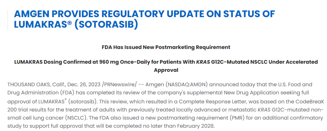 12月26日,安进宣布,FDA已完成对Lumakras(sotorasib)新药补充申请的审查,拒绝完全批准Lumakras用于治疗既往至少接受一次全身治疗的KRAS G12C突变非小细胞肺癌患者。FDA要求安进开展额外的验证性研究,并不晚于2028年2月完成。