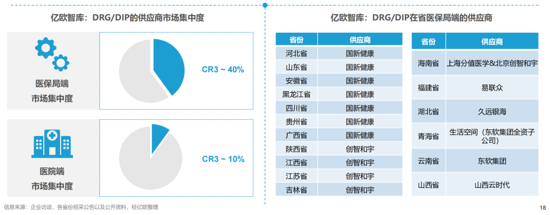 数据显示,已有282个统筹地区开展了DRG/DIP支付方式。通过各省份中标信息可发现,医保局端市场集中度较高,技术领先和口碑好的供应商更易获得政府认可和扶持,具有优势的大型供应商利用其规模、资金、技术、渠道等方面的优势来稳定市场份额,因而局端市场份额集中在头部的供应商手中,根据亿欧预测,医保局端前三位供应商的业务量占整体业务量的40%左右;医院端的市场竞争激烈,市场份额较为分散,是由于各医院运行方式差异较大,因此医院更重视产品差异性能否满足内部需求以及售后服务的跟进能力,因此医院端的市场竞争激烈,市场份额较为分散,根据亿欧预测,医院端前三位供应商的业务量占整体业务量的10%左右。