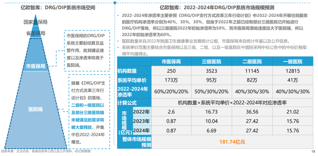 3. 根据亿欧测算,截至2024年,DRG/DIP系统整体市场规模预计为181.74亿元。局端的头部市场趋于饱和,医院端仍有大量需求未被满足,DRG/DIP系统的市场空间将在2024年底前被大量释放。