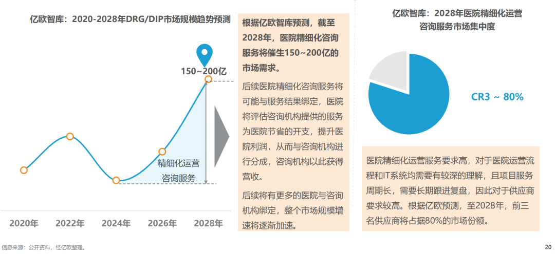 根据亿欧智库预测,截至2028年,医院精细化咨询服务将催生150~200亿的市场需求;前三名供应商将占据80%的市场份额。