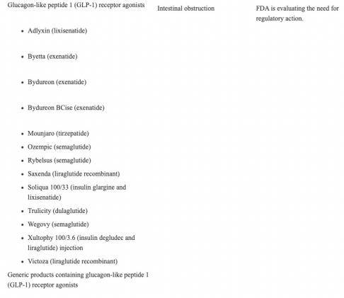 GLP-1药物副作用主要集中在胃肠道不良反应,包括恶心、呕吐、腹泻等。梳理了近几年FDA不良事件报告,其中有关司美格鲁肽、利拉鲁肽等GLP-1受体激动剂药品,被披露有肠梗阻、低血糖、胆囊炎、药物性肝损伤、糖尿病酮症酸中毒等风险。
