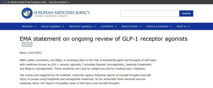 除了上述问题,目前市面上的“减肥药”还有抑郁、自杀、致癌等风险。2023年7月11日,欧洲药品管理局(EMA)公告称,目前收到150个关于此类药物的自残自杀病例报告,将对诺和诺德公司旗下司美格鲁肽等三款产品展开调查。前文提到的纳曲酮Contrave、芬特明和托吡酯缓释胶囊Qsymia也被标注有自杀行为或倾向增加的警告。