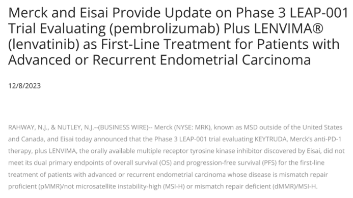 2023年12月8日,默沙东宣布,其Keytruda(帕博利珠单抗)联合Lenvima(仑伐替尼)一线治疗晚期或复发性子宫内膜癌患者的III期LEAP-001研究未能达到总生存期(OS)和无进展生存期(PFS)的双重主要终点。这一消息对于默沙东以及寻求子宫内膜癌有效治疗方法的全球患者来说,无疑是一个巨大的噩耗。