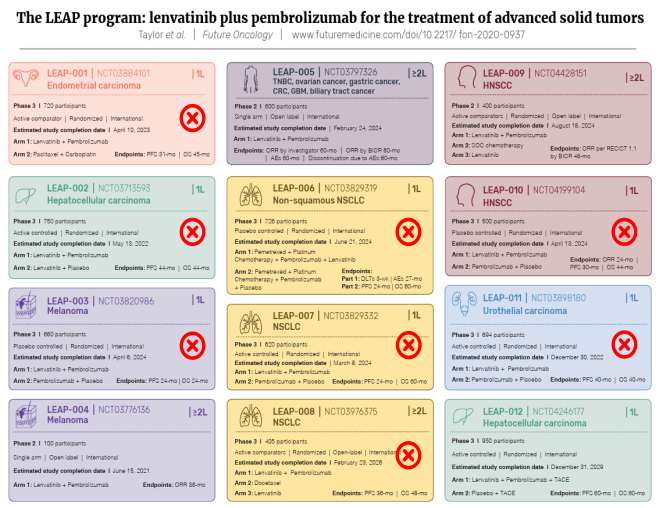 值得注意的是,这并非K药联合仑伐替尼的LEAP项目首次遭遇失败。事实上,LEAP系列的项目在过去的几年中已经经历了多次挫折。LEAP-001、LEAP-002、LEAP-003、LEAP-006、LEAP-007、LEAP-008、LEAP-010、LEAP-011、LEAP-017研究皆失利。