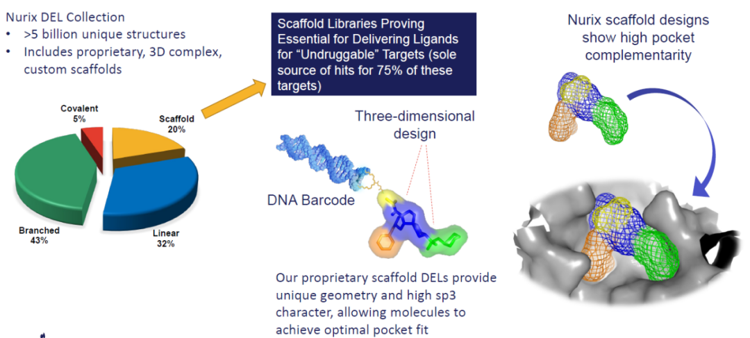Nurix的DNA编码文库包含超过50亿个分子,每个分子都标有唯一的DNA 条形码,它们识别与结合蛋白质靶标,DNA标签允许使用DNA测序技术识别痕量的分子(图1)[1]。