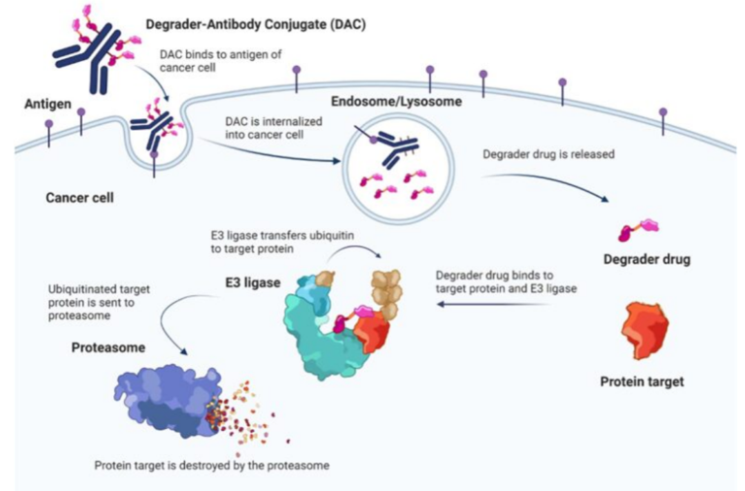 DAC代表了下一代ADC,将TPD的催化活性与抗体的特异性相结合。这种新的治疗方式有可能在两个方面增强疗效和提高安全性。首先,用降解剂代替剧毒ADC有效载荷可以提高安全性和有效性。其次,DAC比传统的降解剂更具选择性,因为DAC将降解剂特异性地递送给肿瘤细胞。因此,通过将降解器技术与ADC相结合,DAC有可能成为传统降解器和现有ADC的下一代替代品(图6)[2]。