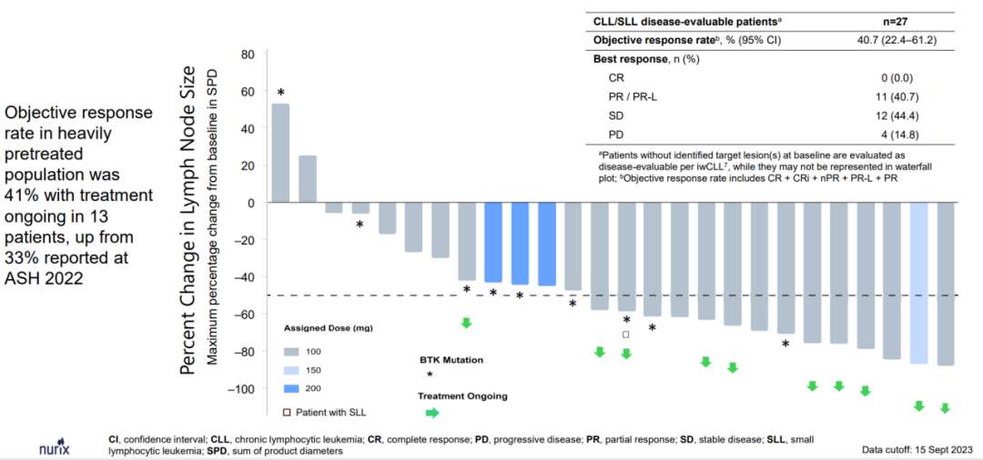研究结果显示:NX-2127治疗导致这一经过大量预处理的患者群体产生令人鼓舞的快速和持久反应,在17名可评估的NHL患者中,有2名(MCL和 DLBCL)报告了完全缓解(CR)。这些反应持续了一年多。还报告了其他NHL患者(MZL和FL)的2例PR。在27例可评估的CLL患者中,11例经历了PR,总缓解率(ORR)为40.7%(图10)。与ASH 2022上公布的早期结果相比有所提高,初步结果显示ORR为33%[10]。