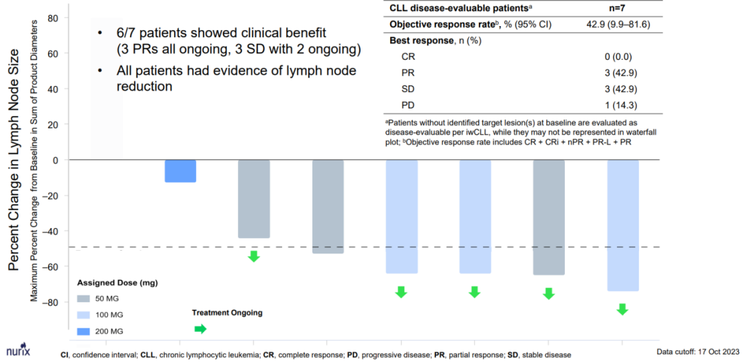 研究结果显示:他们观察到NX-5948显示剂量依赖性药代动力学(PK),导致所有每天口服 NX-5948 治疗的患者发生快速、稳健和持续的 BTK 降解。在接受50至200 mg剂量的CLL人群中,截至2023年10月17日,7名患者中有6名表现出临床益处,其中3名部分缓解(PR)均在进行中,其中1名超过9个月,3 名患者显示疾病稳定(SD),2 名患者正在接受治疗(图12)。