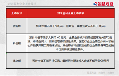 如下图所示,未盈利的biotech,可以依靠标准四“预计市值不低于15亿元,最近两年研发投入合计不低于5000万元”申请上市。