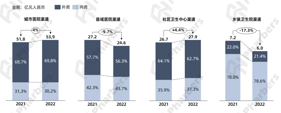 从内外资企业的竞争格局来看,根据法伯全渠道数据显示,2021-2022年外资企业在城市医院、县域医院和社区卫生中心渠道占比均高于50%,而在乡镇卫生院渠道则是内资企业占据优势,销售规模占比近80%(图3)。