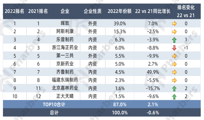 进一步关注总体医疗机构他汀类药物市场头部厂家,根据法伯全渠道数据显示,2022年TOP10企业销售额合计占总体他汀类药物市场的87%,晖致和阿斯利康两家外资企业以绝对优势位列前二。此外,上榜2022年TOP10的企业中,有6家较2021年排名无变化,包括3家外资企业和3家内资企业,其中齐鲁药业2022年他汀类药物销售额同比大涨49.9%(表1)。