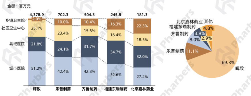 从头部企业的渠道销售额分布来看,晖致、阿斯利康、第一三共3家外资企业在城市医院的占比高于广阔市场3个渠道,而内资企业则普遍在广阔市场贡献度较高,尤其是福建东瑞制药和北京嘉林药业,在县域医院、社区卫生中心和乡镇卫生院的合计占比在70%上下(图4)。