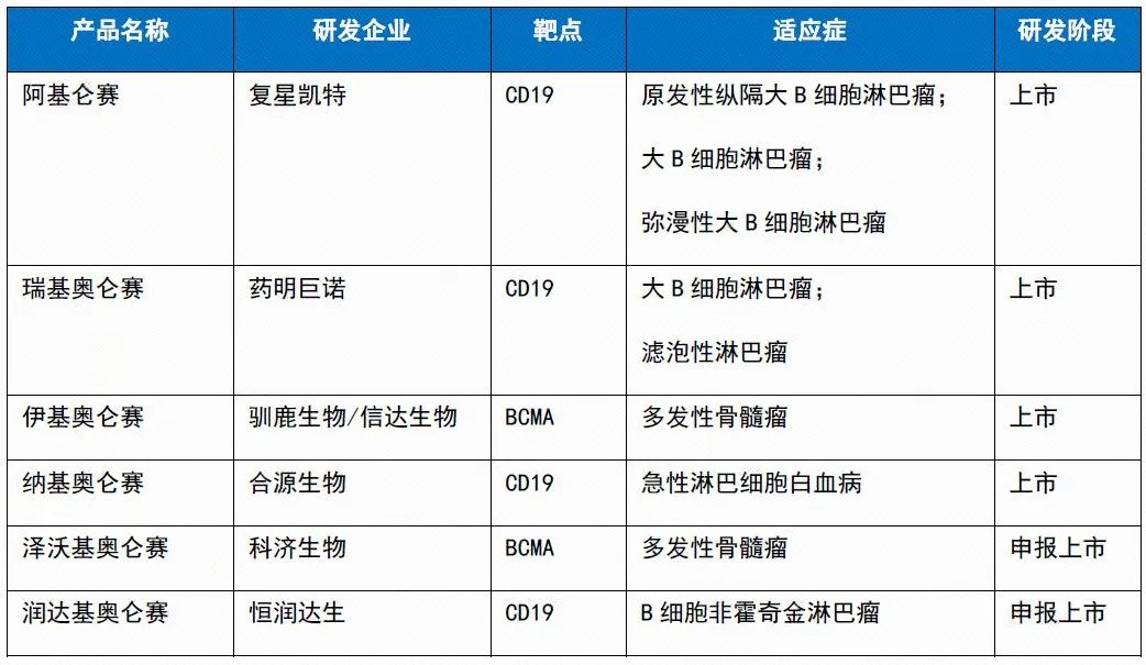 已在中国获批和申报上市的CAR-T细胞治疗产品