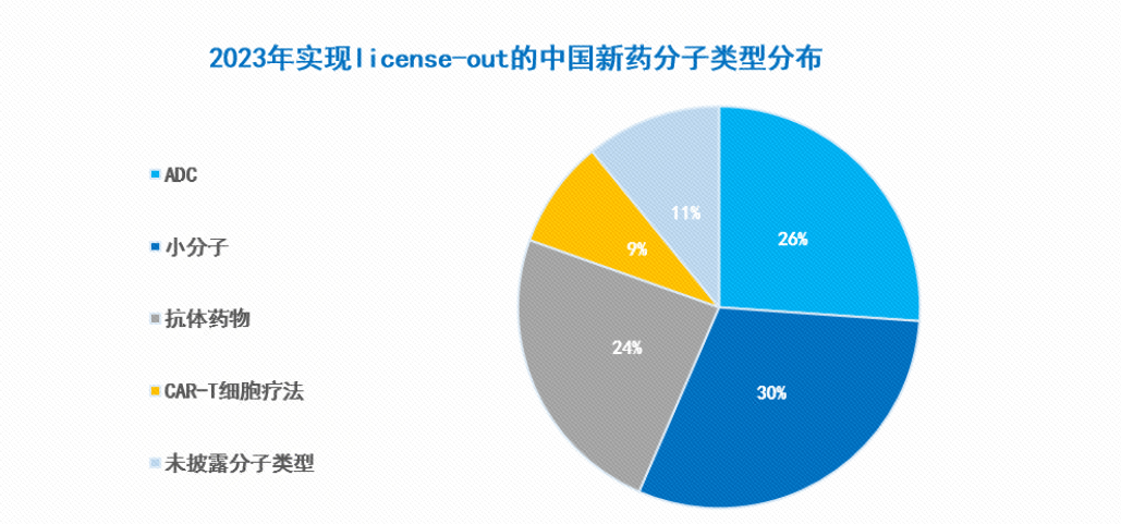 从分子类型来看,2023年达成license-out合作的中国新药覆盖了新型小分子、单抗、双抗、抗体偶联药物(ADC)、CAR-T细胞治疗产品等各种类别。其中,小分子药物和ADC产品数量占比总和接近60%。