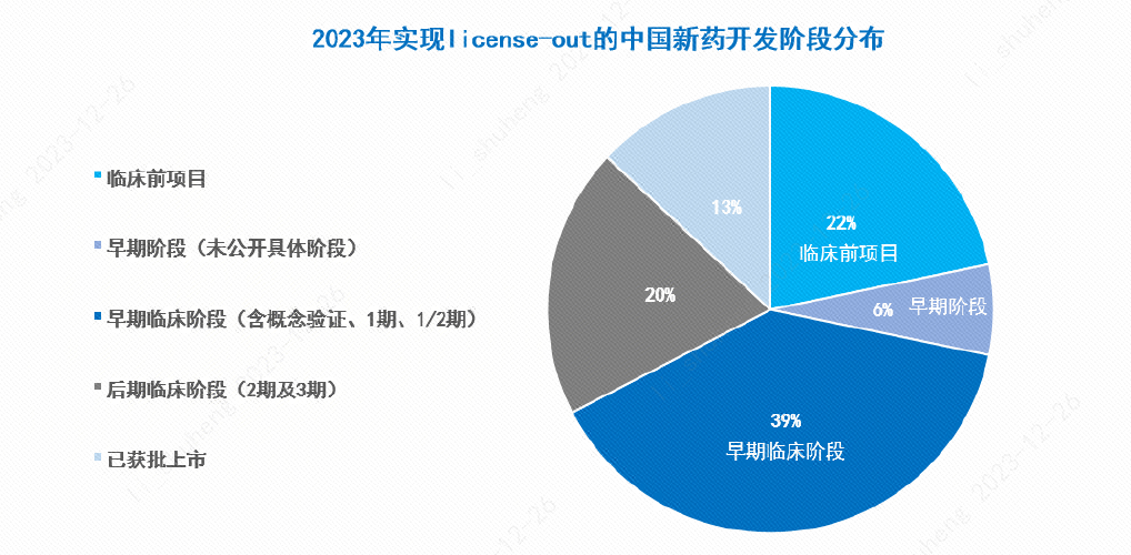 另一个趋势在于,今年这些向国际公司授权的项目越来越向研发更早期的阶段演进。在我们统计的近50款产品中,处于早期开发阶段(包括临床前、1期、1/2期临床开发阶段)的在研产品数量占比约67%。