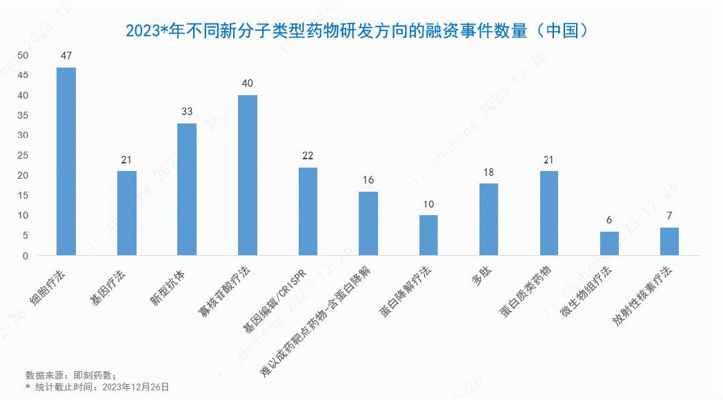 其中,细胞和基因疗法仍然是备受关注的领域,细胞疗法融资事件数量在新分子类型中排在第一位。寡核苷酸药物领域的融资事件数量为40次,排在第二位。其它获得新融资的新分子类型还包括多肽、难以成药靶点药物、新型抗体、蛋白质类药物、微生物组疗法、溶瘤病毒疗法以及放射性核素疗法等。
