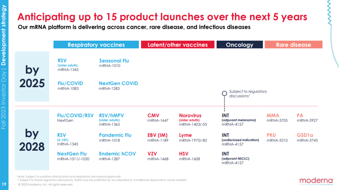 结果显示,mRNA-1345预防两种及以上症状的RSV相关下呼吸道疾病的效力达到83.7%。基于这些结果,Moderna已在多个国家递交mRNA-1345的上市申请,预计于2024年获批上市。