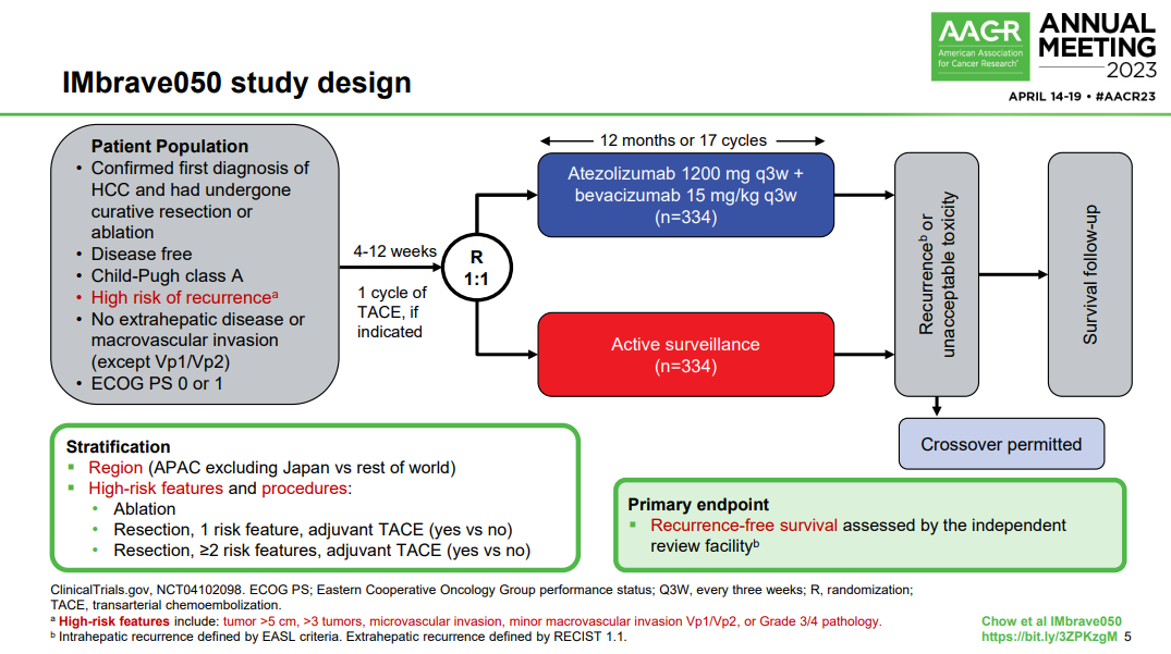 IMbrave050是一项全球多中心、开放标签、随机的III期研究,旨在评估阿替利珠单抗联合贝伐珠单抗作为辅助治疗相比主动监测在进行根治性手术切除或消融术后有高复发风险的HCC患者中的疗效和安全性。