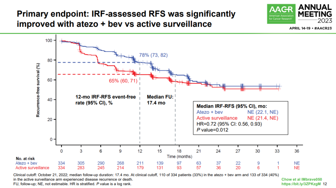 该研究纳入668例患者,他们按1:1随机分为两组,分别接受阿替利珠单抗(每3周1200mg)+贝伐珠单抗(每3周15mg/kg)治疗(治疗时间最长12个月),或只进行主动监测。数据显示,阿替利珠单抗联合贝伐珠单抗可降低患者疾病复发风险28%。