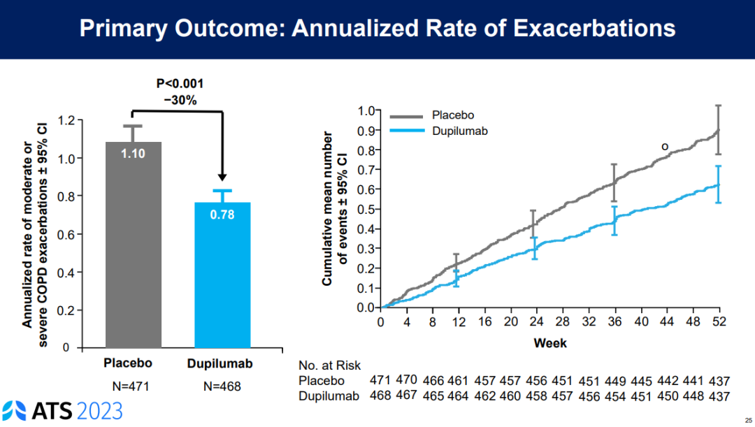 BOREAS是一项随机、双盲、安慰剂对照的III期研究,旨在评估度普利尤单抗在伴发气道疾病2型炎症的中重度COPD患者中的疗效、安全性和耐受性。该研究共纳入939例40-80岁患者,他们每两周随机接受度普利尤单抗或安慰剂治疗,同时联用吸入皮质类固醇(ICS)、长效β受体激动剂(LABA)和长效毒蕈碱拮抗剂(LAMA)三联治疗。