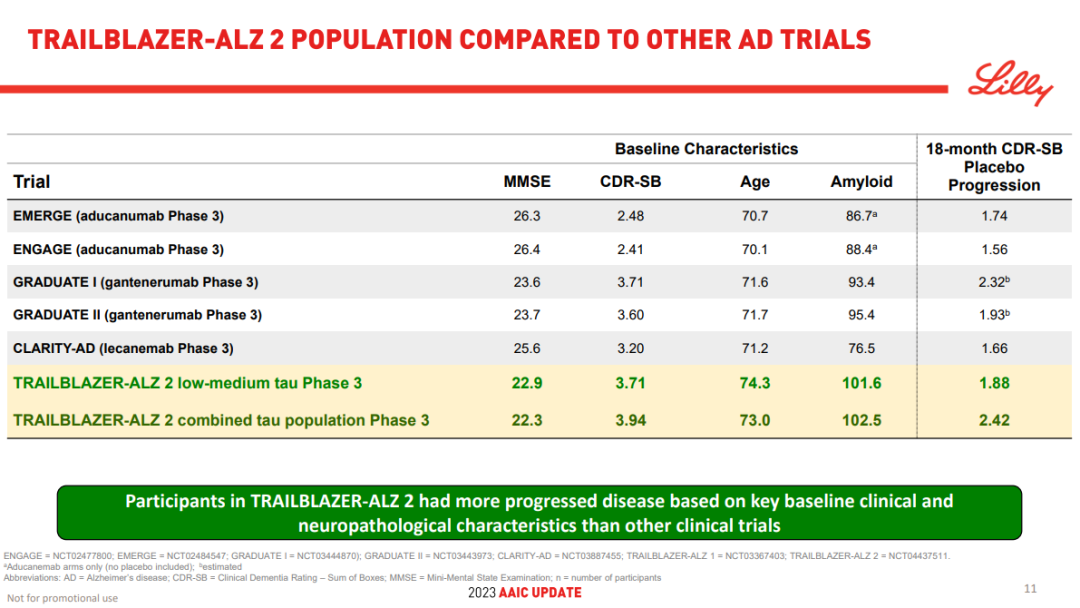 TRAILBLAZER-ALZ 2是一项随机、双盲、安慰剂对照的III期研究,主要分析人群(n=1182)为tau蛋白水平中等且有明显AD临床症状患者。从主要基线的临床和神经病理学特征来看,相比其它试验,该研究入组的患者疾病进展程度更高。
