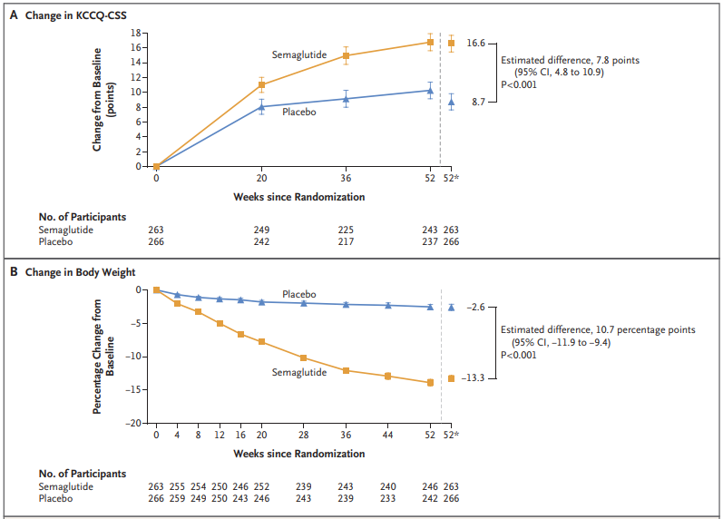 STEP HFpEF研究纳入了529例射血分数保留的心力衰竭(HFpEF)合并BMI≥30的患者,他们随机接受司美格鲁肽(2.4mg)或安慰剂治疗52周。