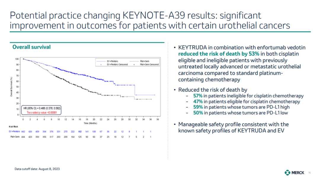 今年4月,FDA基于I/II期KEYNOTE-869/EV-103研究,加速批准了帕博利珠单抗联合维恩妥尤单抗一线治疗局部晚期或转移性尿路上皮癌且顺铂不耐受的成年患者。而KEYNOTE-A39/EV-302研究的成功,使该组合提前5个月获得了FDA的完全批准,代表着转移性尿路上皮癌的潜在治疗范式转变,该组合有望成为尿路上皮癌一线治疗新标准。