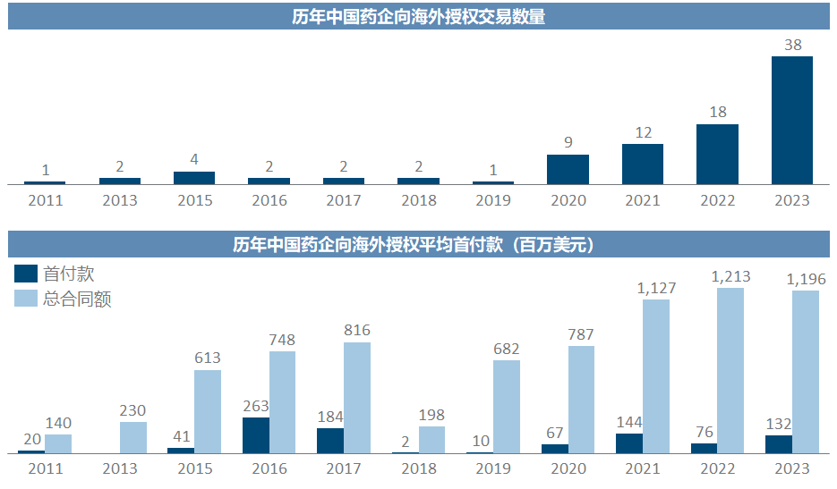 直接暴力上图,中国药企开始批量启动向海外的授权始自2020年、此前基本是零星发生,而2023年的交易数量又几乎等于此前三年之和,且首付款与总交易金额都持续处于高位,这应该就是字面意义上的爆发式增长。