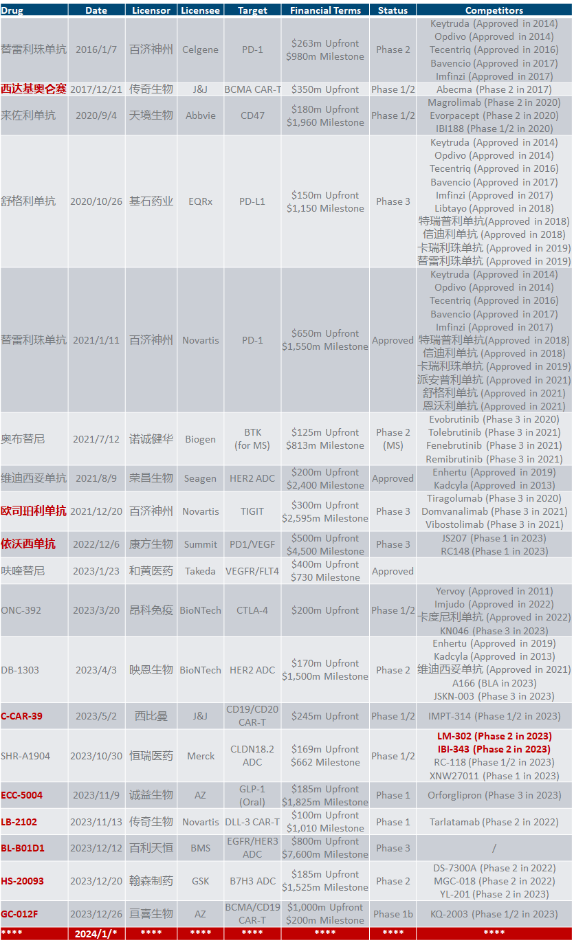 质的评价当然见仁见智,我们选取历史上单笔首付款超过1亿美元的交易(以此作为重要交易的底线标准),通过对比交易发生时目标资产的研发阶段与同类其他竞品管线的研发阶段,来粗线条地判断竞争格局,从而模糊地筛选出其中有哪些品种至少在交易发生时有竞争全球FIC/BIC的潜力。不难发现,在2022年以前出海的国产新药真正妥妥当得起BIC也就是传奇的BCMA CAR-T、百济神州的TIGIT和康方的PD1/VEGF双抗只能说沾的上边;而进入2023年之后的交易资产,则有非常多都已进入同类管线全球进度最快的行列,甚至如百利天恒天价授权给BMS的双抗ADC基本就是独一份。