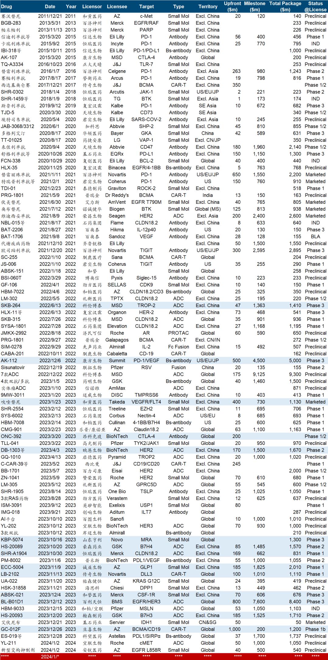 开年第一个工作日,鄙号连年终总结都还没来得及动笔(先挖个小坑放着),就被一日三笔国产新药交易新闻轰得晕头转向。先是宜联以$50m+$1bn向Roche授权尚在临床前的cMET ADC管线YL-211,后是安锐医药以$40m+$500m向AZ授权一款更加早期(甚至还没有代号)的EGFR L858R变构抑制剂,以及药明巨诺与2seventy之间的合作。