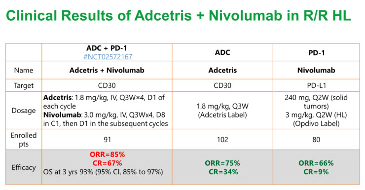 一个临床案例是在Adcetris(抗CD30 的MMAE类ADC)联合 PD-1抑制剂Opdivo(nivolumab,纳武利尤单抗)治疗复发或难治性霍奇金淋巴瘤 (HL) 患者的I/II期临床试验中(NCT02572167),Adcetris联合 Nivolumab展现了85%的ORR和67%的CR,几乎是关键II期试验中Adcetris单药治疗CR率的两倍。