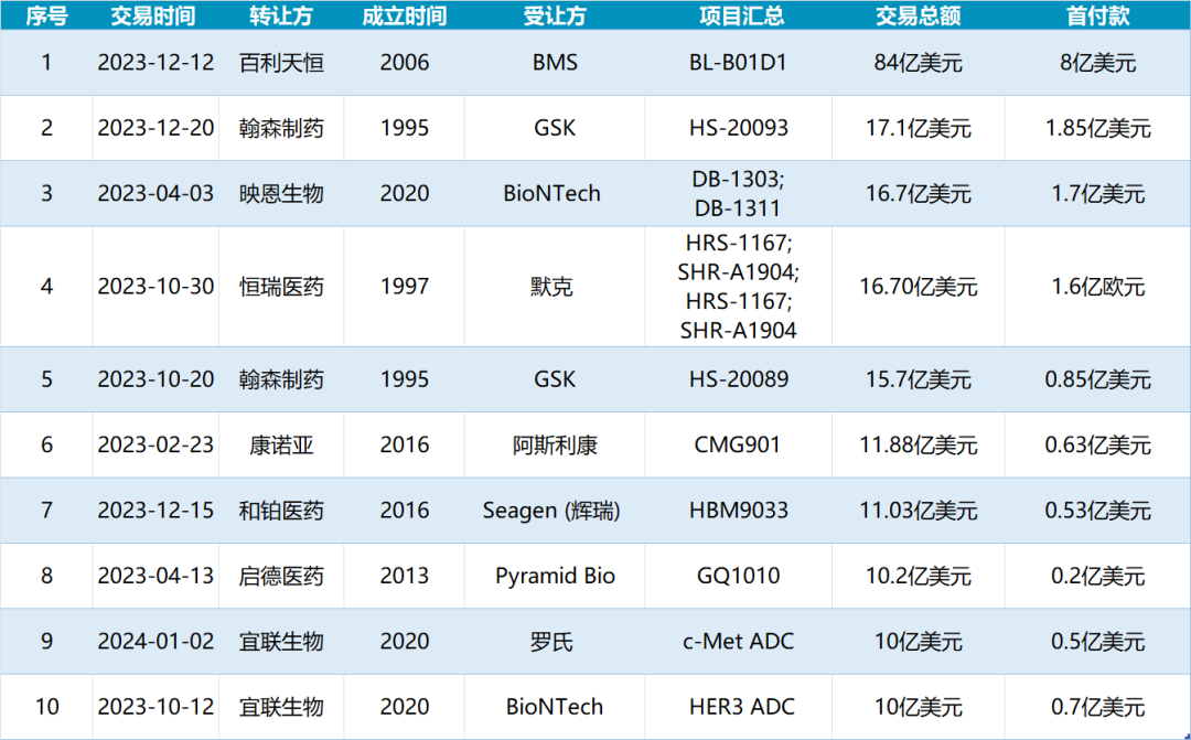 2023年至今中国ADC BD出海交易TOP10