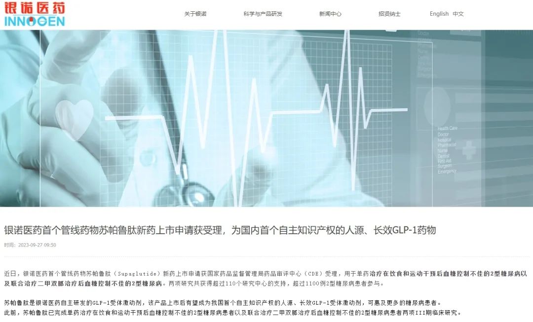 就在今年9月,银诺医药苏帕鲁肽新药上市申请获国家药品监督管理局药品审评中心(CDE)受理,用于单药治疗在饮食和运动干预后血糖控制不佳的2型糖尿病以及二甲双胍治疗后血糖控制不佳的2型糖尿病患者的联合治疗。该产品上市后,有望成为我国首个自主知识产权的新一代人源化超长效GLP-1受体激动剂。