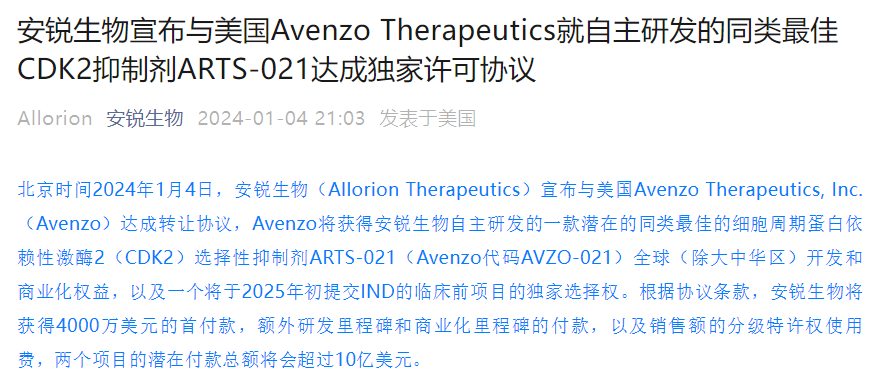 1月4日,安锐生物(Allorion)宣布与Avenzo Therapeutics达成转让协议,后者将获得安锐生物自主研发的一款潜在的同类最佳的细胞周期蛋白依赖性激酶2(CDK2)选择性抑制剂ARTS-021(AVZO-021)全球(除大中华区)开发和商业化权益,以及一个将于2025年初提交IND的临床前项目的独家选择权。
