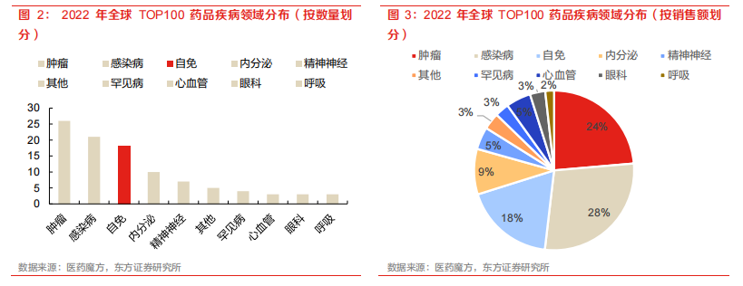在全球药物销售额贡献中,自免疾病药物贡献仅次于肿瘤与感染。从2022年全球TOP100药物销售情况来看,共18款自免疾病药物进入TOP100榜单,销售额超过6000亿人民币,占总销售额约18%。