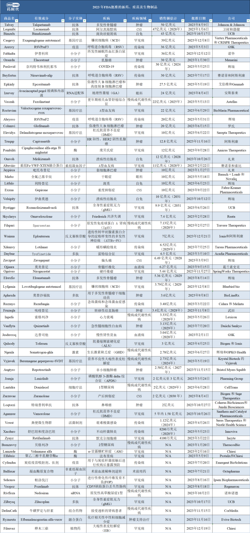 下图为2023年FDA批准的新药、疫苗及生物制品汇总表。