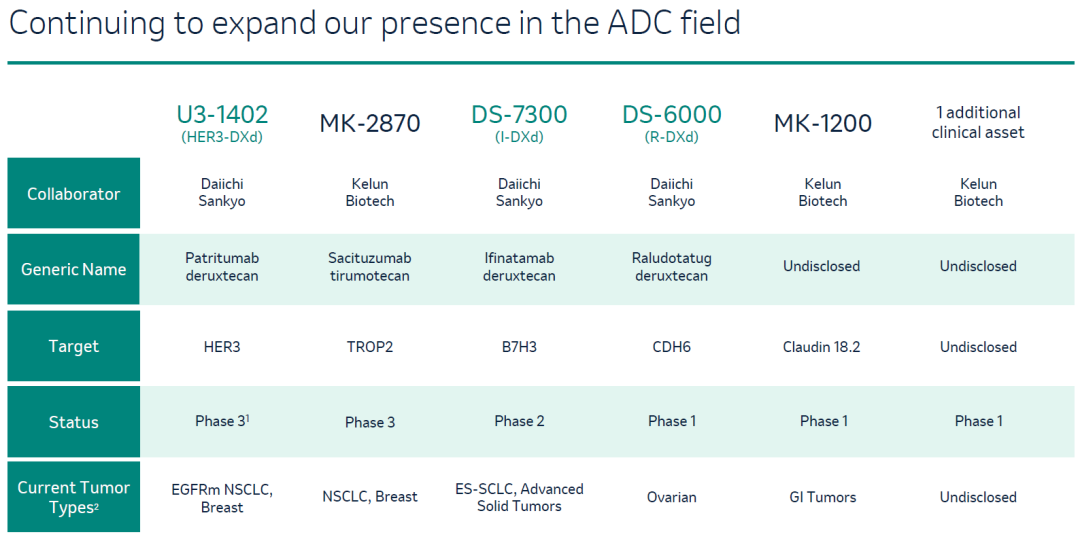 围绕ADC领域,默沙东进行了积极布局,先后携手科伦博泰、第一三共。默沙东研发实验室总裁Dean Li强调,科伦博泰、第一三共的合作都很重要,已经列入管线中的6款ADC新药,3款来自科伦博泰、3款来自第一三共,适应症各有不同。科伦博泰引进的3款ADC分别为SKB264(MK-2870)( Trop2 ADC)、MK-1200(Claudin18.2 ADC)、第3款未公开,第一三共引进的3款ADC分别为U3-1402(HER3 ADC)、DS-7300(B7-H3 ADC)、DS-6000(CDH6 ADC)。