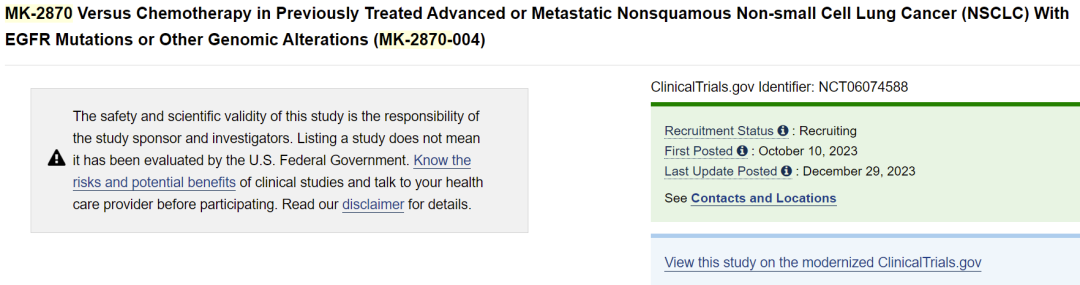 2023年10月份以来,默沙东围绕SKB264(MK-2870)已经密集启动了三项三期临床。2023年10月10日,默沙东启动了SKB264(MK-2870)治疗复发性或转移性EGFR突变非鳞状非小细胞肺癌的三期临床。