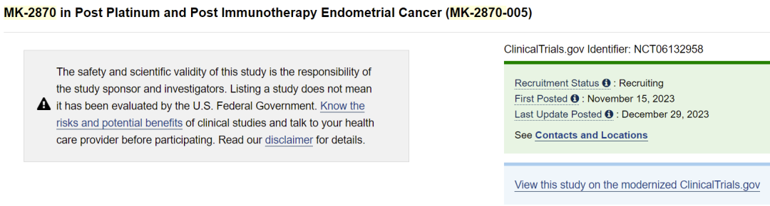 2023年11月15日,默沙东启动了SKB264(MK-2870)治疗子宫内膜癌的3期临床。