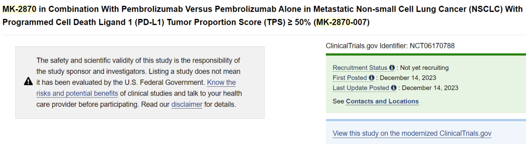 2023年12月14日,默沙东启动SKB264(MK-2870)联合Keytruda一线治疗PD-L1高表达(TPS≥50%)转移性非小细胞肺癌的三期临床。