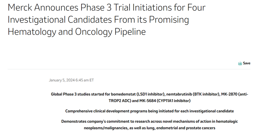 根据默沙东最新公布的消息,其血液肿瘤和实体肿瘤领域的4款候选药物已启动多项关键III期临床研究,包括LSD1抑制剂Bomedemstat、BTK抑制剂Nemtabrutinib、TROP2 ADC MK-2870和CYP11A1抑制剂MK-5684。