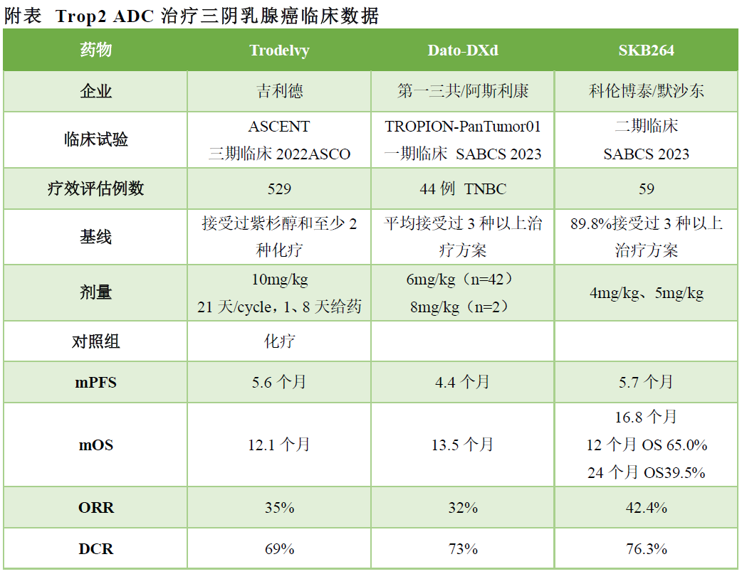 SKB264(MK-2870)的分子设计为其成为最优Trop2 ADC奠定了基础,临床数据则证实其具有BIC的潜力。以三阴乳腺癌为例,SKB264(MK-2870)与Trodelvy和Dato-DXd相比在后线治疗三阴性乳腺癌取得更好的缓解率和生存获益数据。