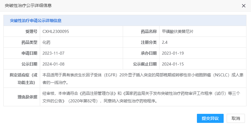 1月8日,CDE网站显示,艾力斯医药的甲磺酸伏美替尼片拟纳入突破性治疗品种,用于一线治疗具有表皮生长因子受体(EGFR)20外显子插入突变的局部晚期或转移性非小细胞肺癌(NSCLC)成人患者。