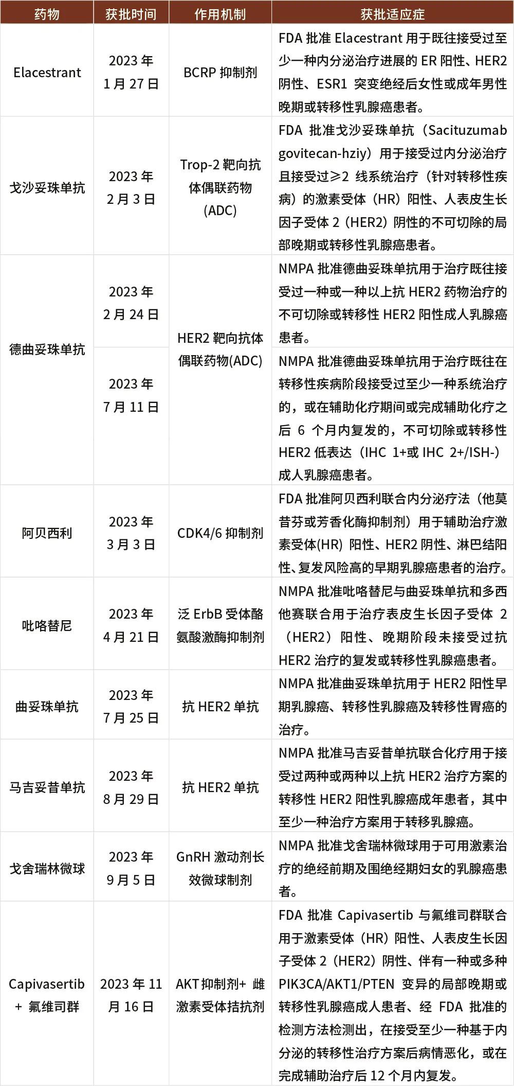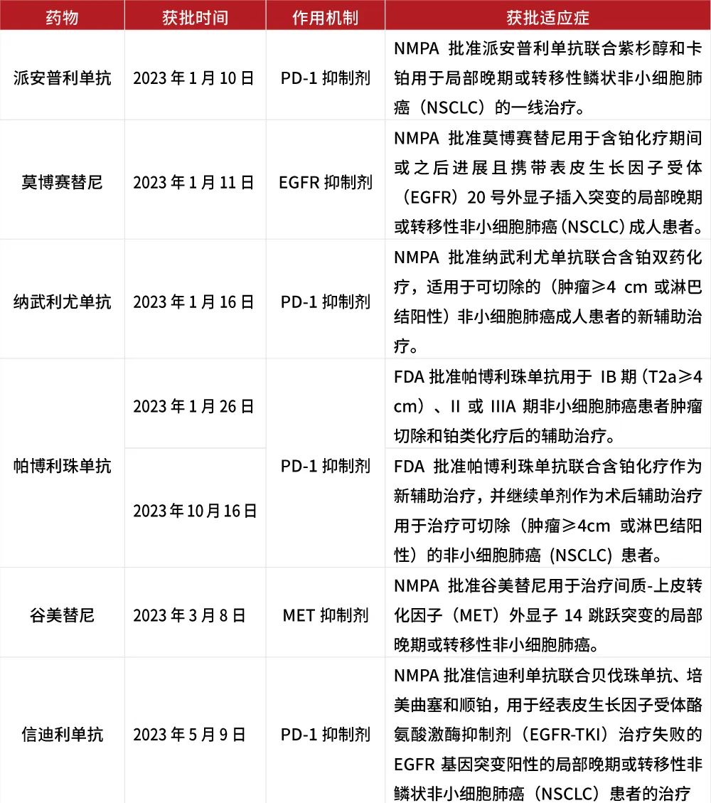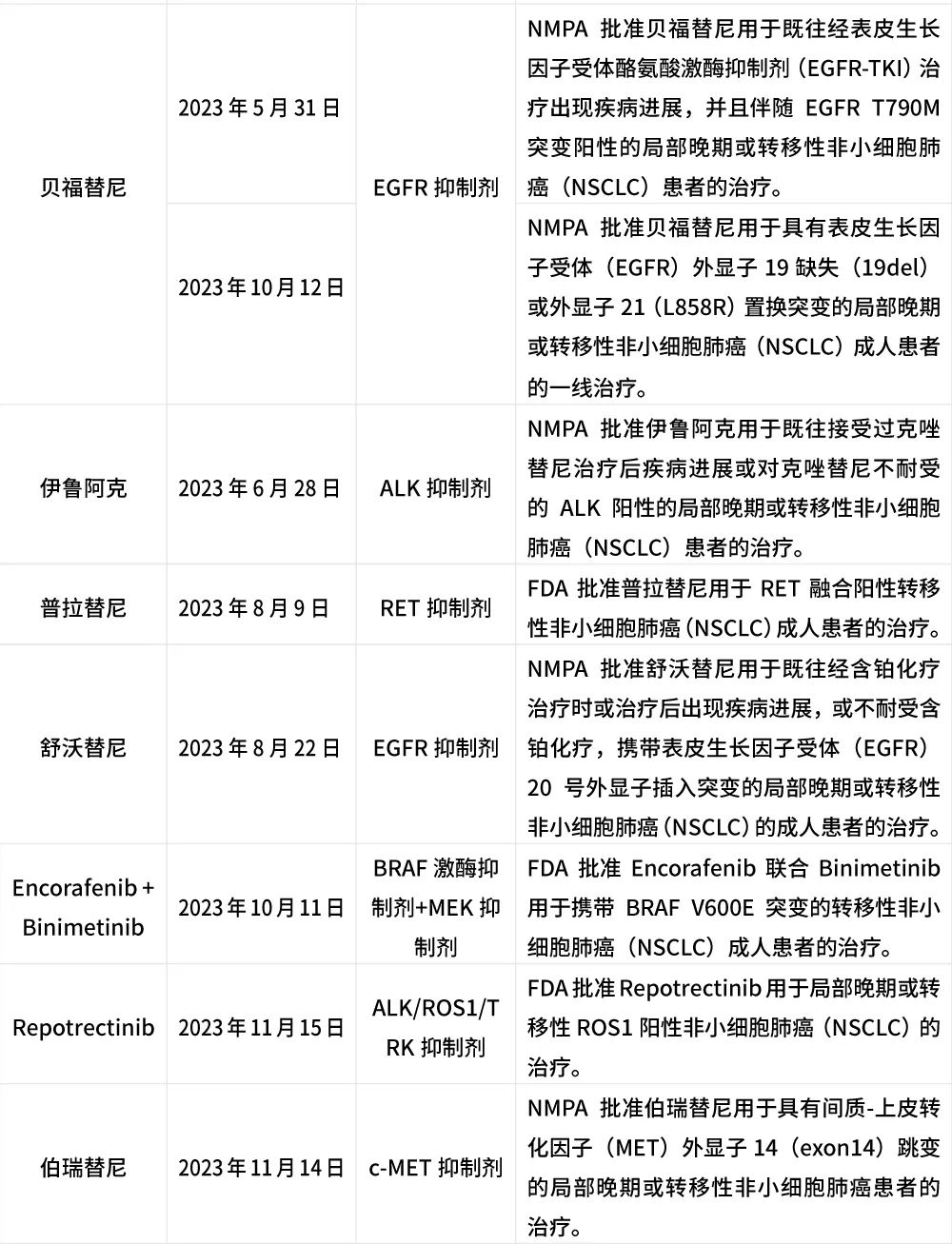 让我们一同回顾这些重要的进展,探讨它们在肿瘤治疗领域所带来的深远影响。现依据FDA和NMPA发布的药品批准证明文件,以及各公司的公开信息,为大家整理2023年度实体瘤领域获批的药物及适应症,以供参考。