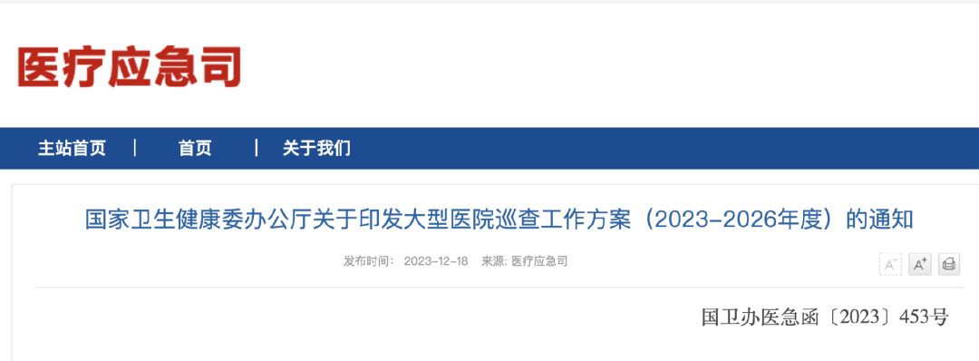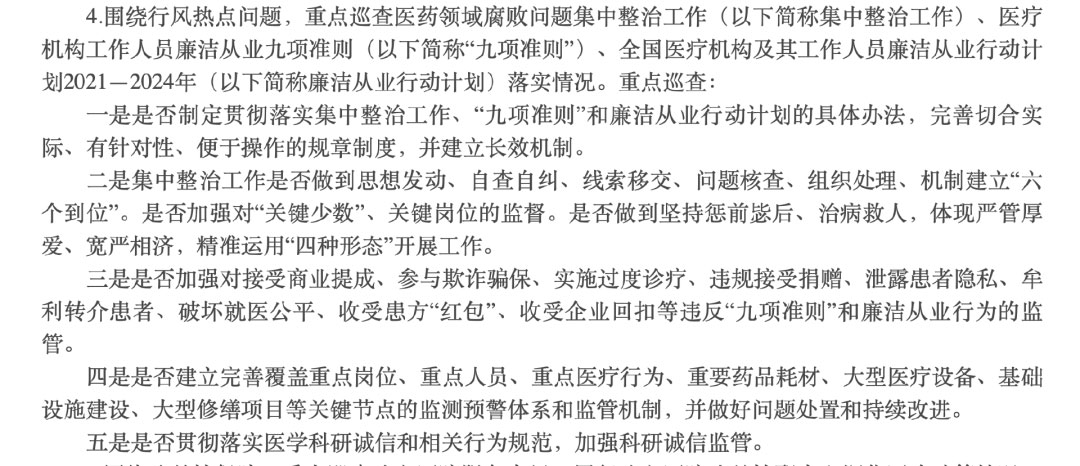 与此同时,第五轮全国大型医院巡查正式启动,巡查对象为二级(参照二级管理)及以上公立医院(含中医医院)——三级综合医院巡查时间原则上不少于7天,三级专科医院、妇幼保健院和二级医院原则上不少于5天。