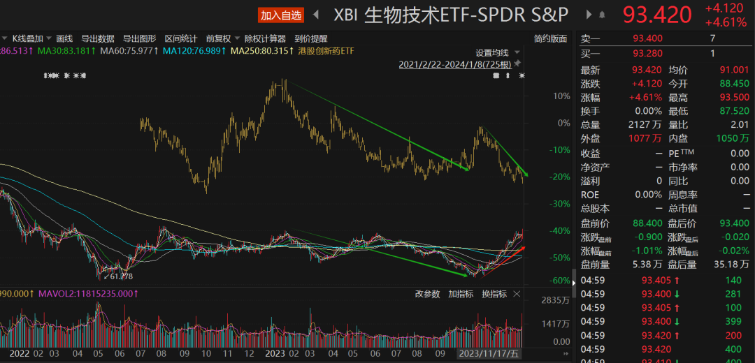 可以看到,目前美联储尚未进行上一轮加息周期以来的第一次降息,10月底以来XBI已经上涨了超过40%,表现出十足的弹性。