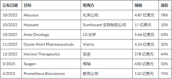 统计2022年四季度和2023年一季度海外发生的7宗生物科技并购案,可以看到平均溢价幅度在45%左右。
