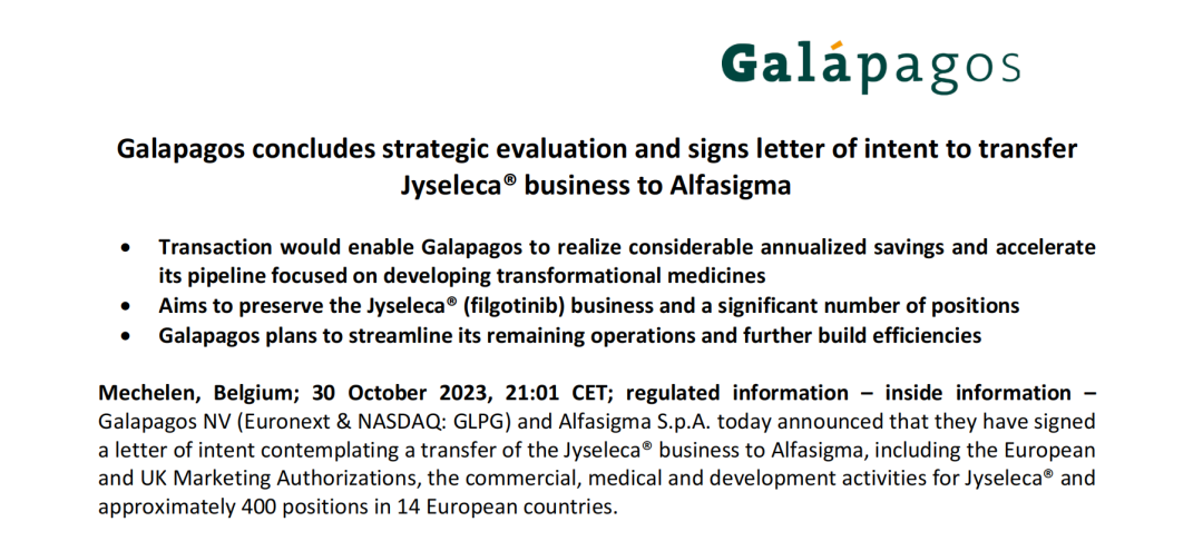 2023年10月30日,Galapagos宣布已和Alfasigma签署意向书,将Jyseleca业务转让给Alfasigma,包括欧洲和英国的营销授权、Jyseleca的商业、医疗和开发活动以及在14个欧洲国家的约400个职位。在拟议的交易中,Galapagos将获得5000万欧元的首付款、潜在的里程碑付款总额为1.2亿欧元以及欧洲销售额的中个位数至中两位数的特许权使用费。到2025年6月之前,Galapagos将向Alfasigma支付高达4000万欧元,用于Jyseleca的相关开发活动。此外,Galapagos还计划精简剩余业务,进一步提高效率,公司预计每年可节省1.5~2亿欧元。