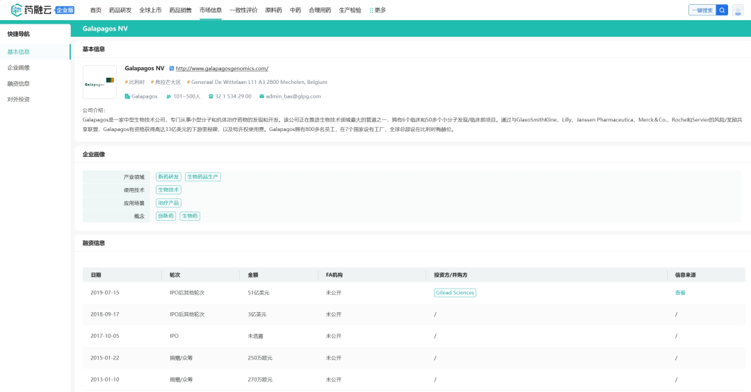 自成立以来,公司总融资五轮,最近的一次是2019年7月,与吉利德科学达成了10年的全球研发合作协议,潜在金额高达50.5亿美元。根据协议,Galapagos获得39.5亿美元的预付款和11亿美元的股权投资。吉利德获得一系列创新的化合物组合,以及在欧洲以外所有国家开发和商业化当前和未来项目的独家权益。此次合作最成功的结果就是Galapagos前不久决定转让的旗下唯一商业化的产品——JAK抑制剂Filgotinib。