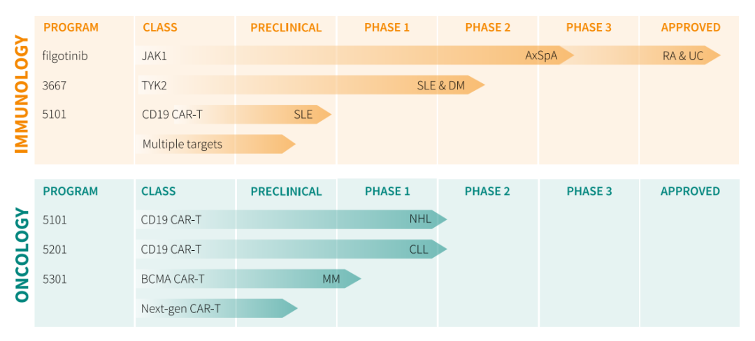 曾经公司市值高达120亿欧元(约140亿美元),在经历重大研发失利之后。公司进行重大战略调整,现在的Galapagos主要专注于免疫学、肿瘤学和其他治疗领域的研究创新。在免疫学中的管线主要涉及类风湿性关节炎(RA)、溃疡性结肠炎(UC)、轴向脊椎关节炎(AxSpA)、皮肌炎(DM)和系统性红斑狼疮(SLE)。肿瘤学管线主要涉及非霍奇金淋巴瘤(NHL)、慢性淋巴细胞白血病(NHL)和多发性骨髓瘤(MM)。